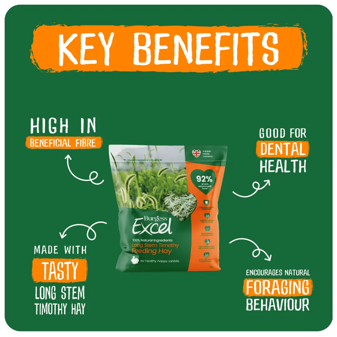 Burgess Excel Long Stem Feeding Hay er timotehø, der skæres på det rette tidspunkt og tørres inden for 48 timer. De lange strå tilfredsstiller både tyggebehovet for tandpleje og det naturlige fourageringsinstinkt, hvilket giver kaniner den følelsesmæssige berigelse, de har brug for.