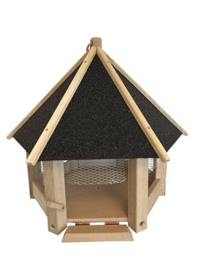 Flot kvalitets fuglefoder hus på fod med tagpap tag og net, så de store fugle ikke "bare lige" kan komme til foderet.