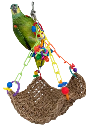 Består af søgræs og alle slags plastdetaljer. Krogen sikrer, at den kan fastgøres i buret sikkert og sikkert.