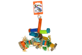 Munter farvet legetøj lavet af træ og udstyret med reb og en klokke. Let at fastgøre til fuglens bur takket være karabinhage.