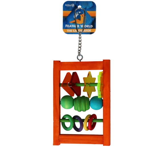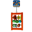 Denne kugleramme er lavet af træ- og plastkomponenter og er designet som et legetøj til fugle.
