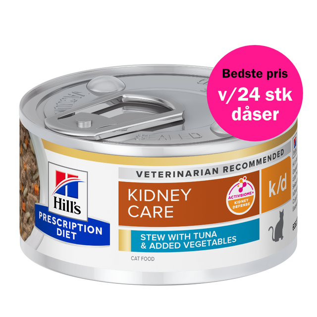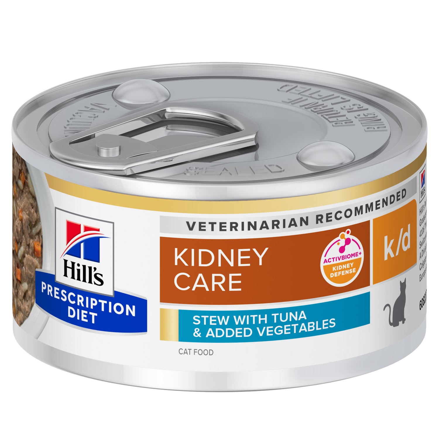 Hill's Prescription Diet k/d Stew er et klinisk dokumenteret diætetisk vådfoder til katte med nedsat nyrefunktion. Foderet er udviklet af Hill's dyrlæger og ernæringseksperter og indeholder ActivBiome+ Kidney Defense – en unik præbiotisk blanding, som understøtter tarmens mikrobiom og nyrefunktionen.