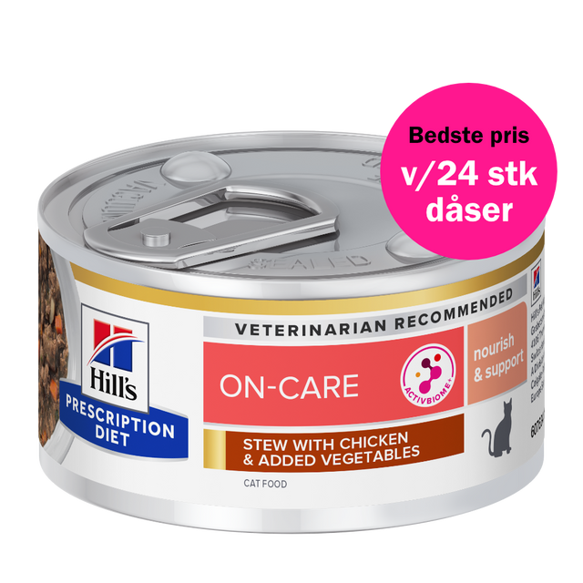Hill’s Prescription Diet ON-Care Stew er pakket i praktiske 82 g dåser og sælges her som en eller samlet pakke med 24 stk. Det gør det nemt at dosere korrekt, og konsistensen i form af gryderet gør det særligt velegnet til katte, der foretrækker vådfoder frem for tørkost.