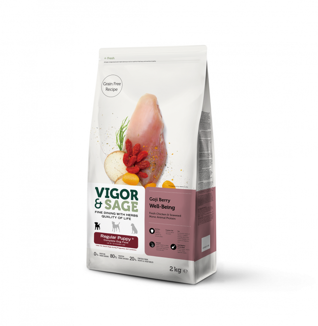 Vigor & Sage Wolfberry Well-Being Regular Puppy er et komplet kornfrit hvalpefoder, der understøtter din hvalps vækst, immunforsvar og generelle trivsel. Opskriften kombinerer frisk udbenet kylling med superfoods som ulvebær (gojibær), grøn te og ginseng – en perfekt start på livet!