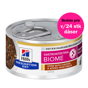 Hill’s PRESCRIPTION DIET Gastrointestinal Biome Stew med kylling og tilsatte grøntsager er et højt fiberholdigt, diætetisk fuldfoder udviklet i samarbejde mellem Hill’s ernæringseksperter og dyrlæger. Det understøtter sund tarmfunktion og er særligt velegnet til katte med fiberresponsive fordøjelsesproblemer.