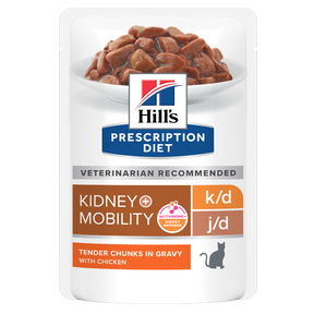 Støt både nyrer og led hos din kat med ét og samme foder. Hill's PRESCRIPTION DIET k/d + Mobility vådfoder med kylling kombinerer den veldokumenterede ernæring fra k/d Kidney Care med j/d Joint Care-teknologi, der er udviklet til at støtte mobilitet og livskvalitet hos katte.