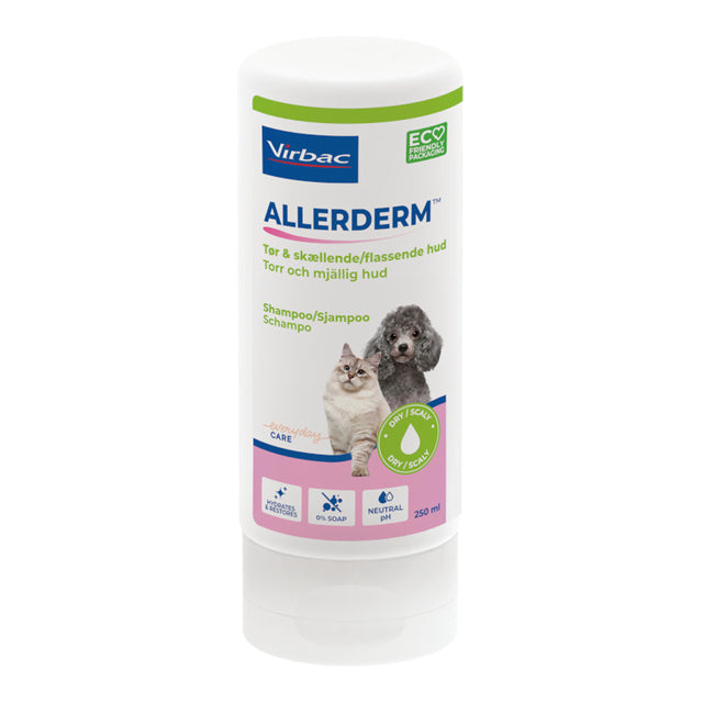 • Allerderm™ Tør hud er en plejende shampoo, der fugter huden og mindsker dannelsen af skæl. Designet til hyppig brug for at optimere hud- og pelsforholdet hos hunde og katte i alle aldre.